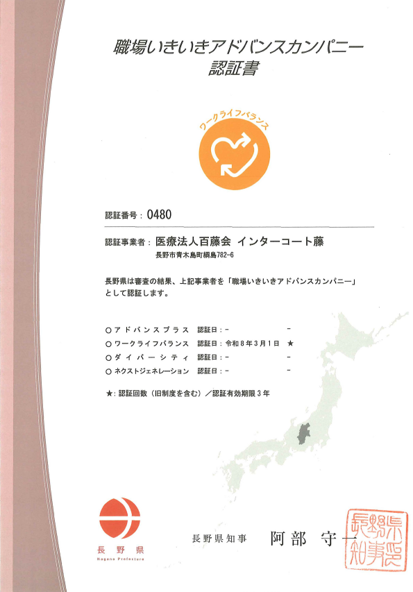当法人は、長野県が推進する「職場いきいきアドバンスカンパニー(ワークライフバランスコース)」の認証を取得しています。仕事と家庭の両立支援や働きやすい職場環境の整備を通じて、職員一人ひとりがいきいきと能力を発揮できる企業を目指しています。