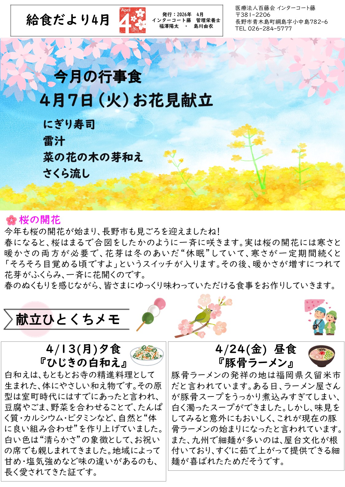 今月の給食だよりは「桜の開花」「春の食中毒予防」についてご紹介しています。